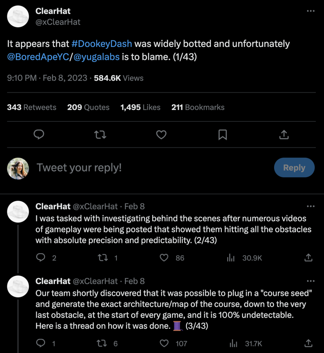 核心逻辑是:Dookey Dash 虽然看似随机且循环,但实际上选择的进程是有限的。这个进程实际上取决于一个「进程种子」(course seed),多次进入游戏时,只要在本地插入了相同的种子,就能生成完全相同的游戏进程,从奖励到障碍物。Yuga Labs 本身设置的防作弊逻辑是,只要「本地进程种子对应的游戏过程」和「玩家实际操作输入服务器的数据」匹配,则认定玩家为真人。有了确定的进程地图后,作弊者可以设计一个基于规则的 bot,或者利用最佳路径算法,在收集碎片的时候高效通过这些障碍物。由于 bot 本身可以模拟鼠标移动和点击,因此很难根据 bot 判断是否作弊——玩家甚至可以开着 Twitch 直播自己打游戏,实际上只是在锁定了的鼠标上胡乱移动,而屏幕上的小猴无比精准地躲过一个个障碍并收集足够多的碎片,假装相当入迷的同时,收获一片欢呼和喝彩。