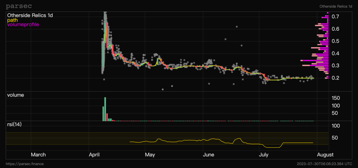 Otherside 对这次体验的交付无疑是超预期的,但这样的超预期并没有带来 Otherdeed 价格的提升。2 nd Trip 胜利者的奖品是一枚头盔,Otherside Relics,共 2220 枚,由 Otherside 空投到胜利队伍对应的 Otherside 持有者的钱包。空投到账的当天,Otherside Relics 的价格曾高达 0.7 ETH, 现在仍有 0.2 ETH 的地板价。