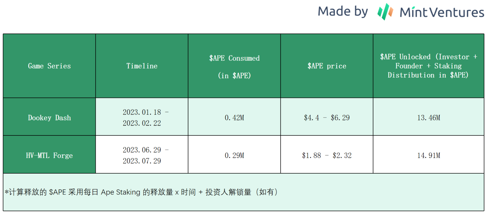 在这个前提下,我们可以对 Dookey Dash 和 HV-MTL 消耗的 $APE 分别进行分析: