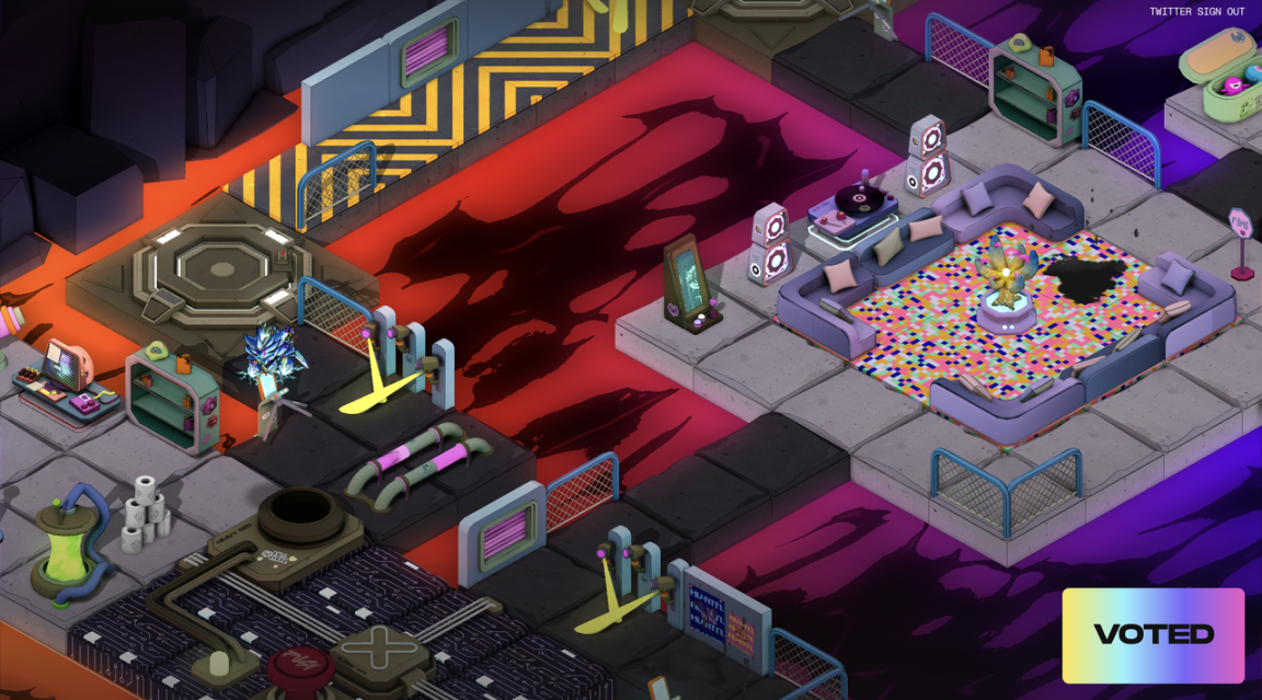 也许是这篇 thread 传播度之广足够引起重视,或者 Yuga Labs 本就安排好了下一阶段改变策略,HV-MTL 的 Forge 用了相当巧妙的方式来弱化 bot 和外挂给竞技体验带来的影响:投票。六个阶段中,每个阶段的 AMP 等级由排名决定,排名由投票决定,并且用户可以选择 upvote 和 downvote——即使使用机器人刷票把自己的 HV-MTL 顶到最高,只要基地的画面名不符实,或者其他玩家一致认为票数的增长不符合常识,那么也可能被 downvote 到很低的排名。
