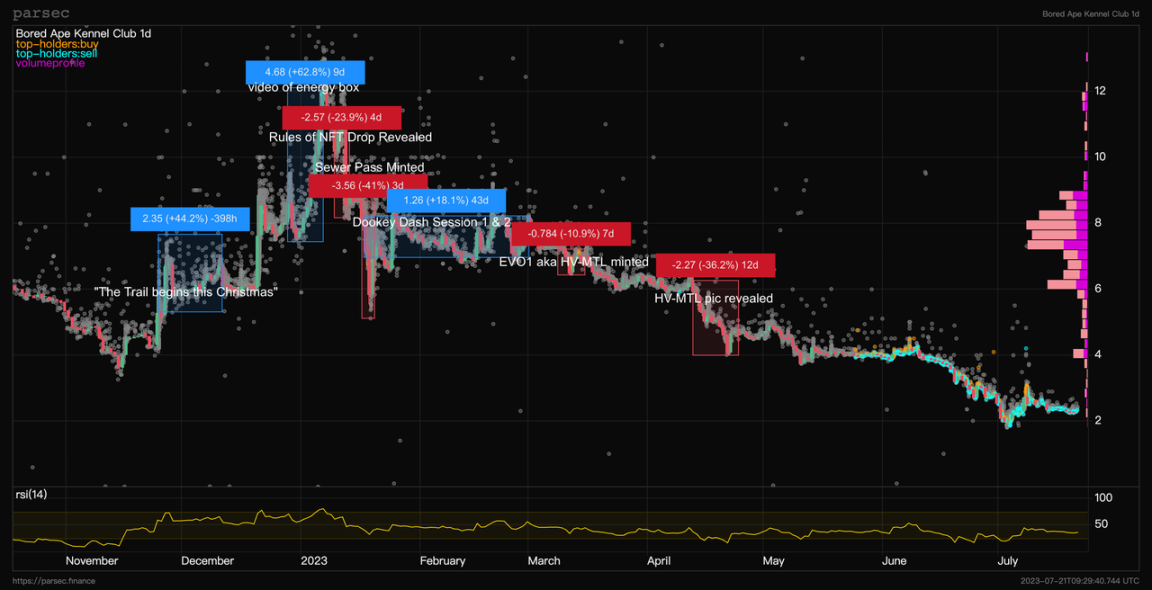 这也标志了 Yuga 系列的 NFT 本次上涨的起点,以 BAKC 为例,在后续发布关键叙事、游戏规则的几个节点,都是 BAKC 价格变化的关键点。