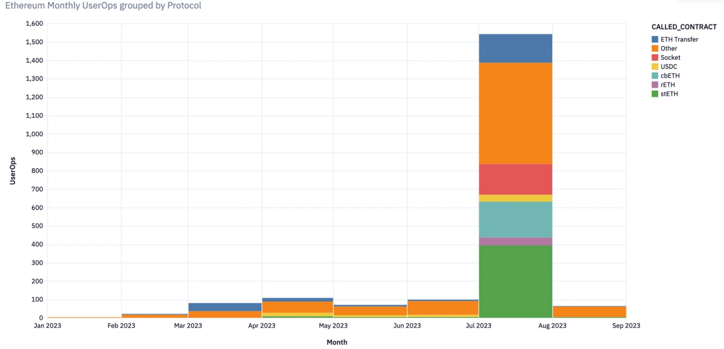 以太坊上的智能账户活跃很大一部分都集中在流动性质押上。7 月份, 41% 的 UserOps 由铸造和转移 stETH、cbETH 和 rETH 产生。
