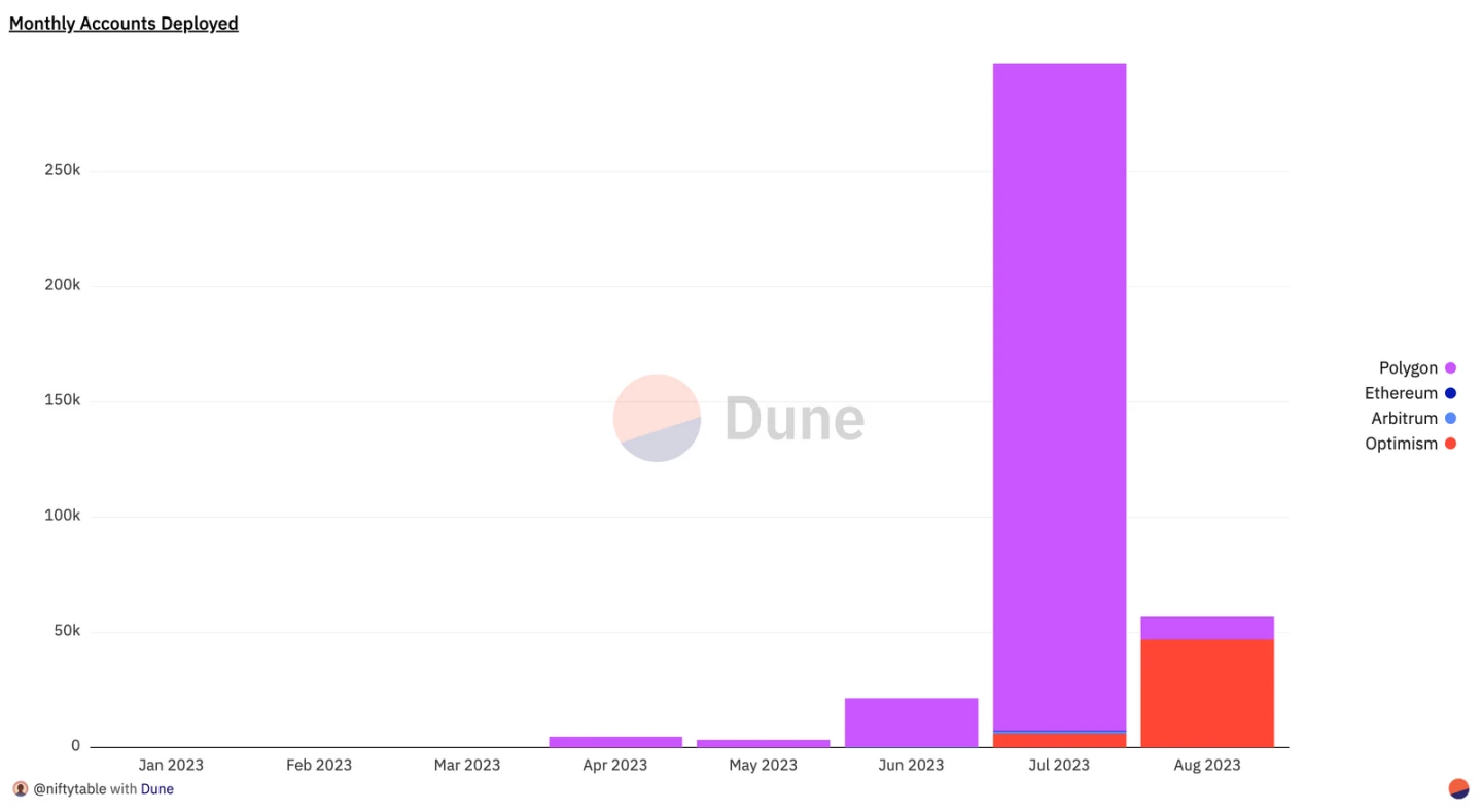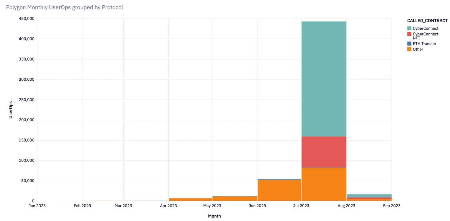 7 月份,由于 CyberConnect (一个所有账户都是 ERC-4337 钱包的社交网络)推出代币,Polygon 经历了 ERC-4337 采用量的大幅飙升。仅 7 月份,CyberConnect 就带动了约 36 万次的 UserOps。