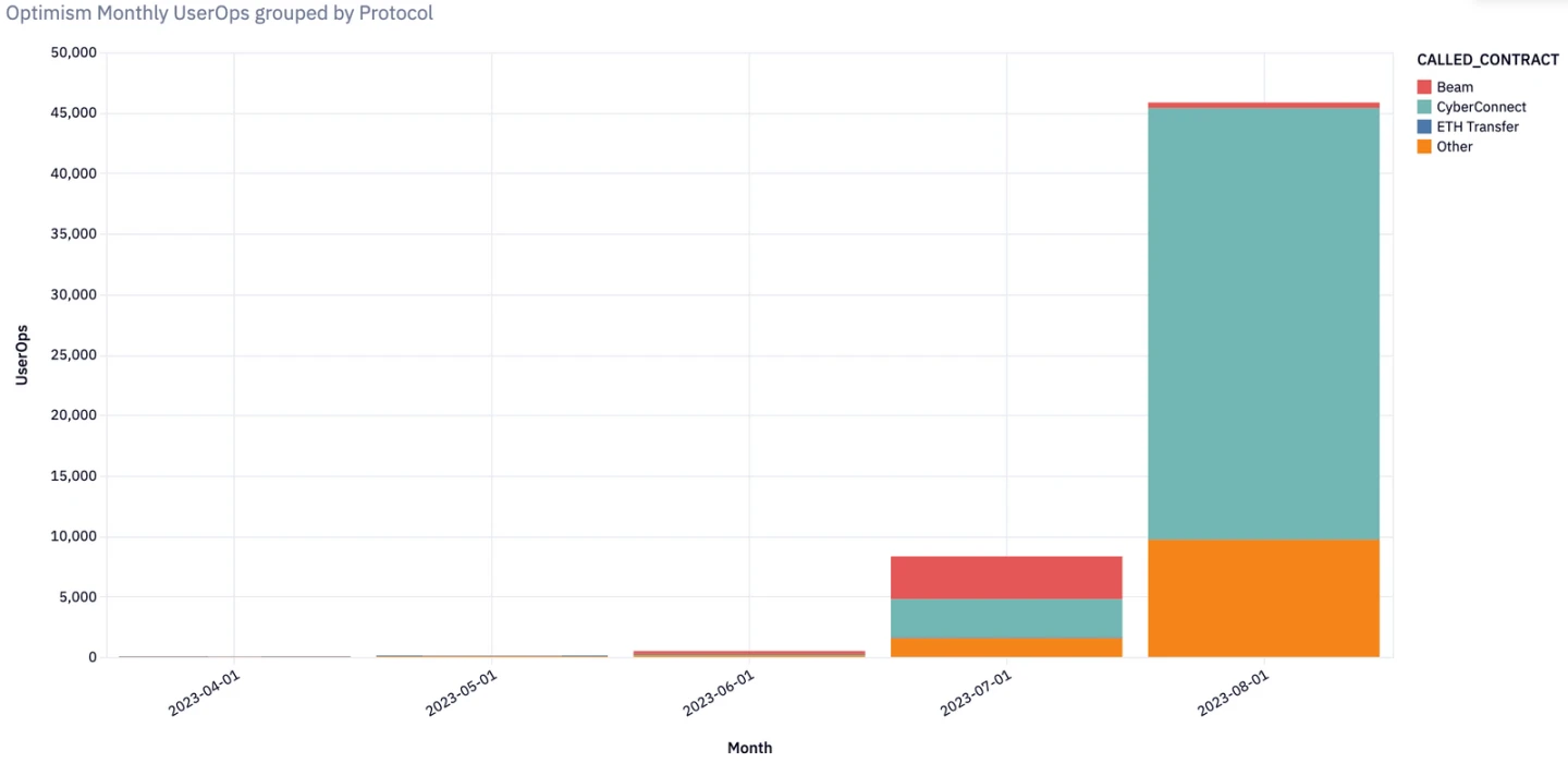 同样,随着 CyberConnect 在 L2 上推出,ERC-4337 的使用量在上周开始飙升。8 月前 4 天的 UserOps 数量是 整个 7 月的 4 倍以上。