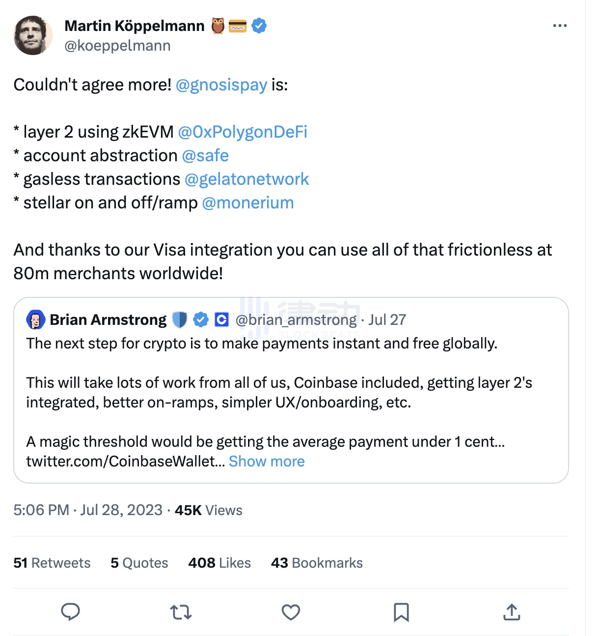 3)非托管钱包意味着银行或交易所等中心化实体方无法访问用户的资金。对于消费者来说,这是一个越来越具吸引力的实际需求,尤其是在 FTX 事件发生之后。非托管并不意味着不合规,相反,获得采用,必须合规,朝着正确的方向。而这也是我们看到的一个趋势。Fractal 提供 KYC 身份验证服务,保证遵守「数据隐私」法。此外,Gnosis Pay 的合作伙伴会对进入 L2 帐户的资金进行反洗钱 (AML) 和打击资助恐怖主义 (CFT) 筛查。对于 Gnosis Pay 来说,基于 Polygon zkEVM 构建的 L2 方案不仅可以低成本处理大量支付,而且还确保最终的合规性。