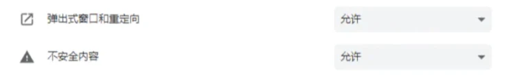 点击锁图标,进入网站设置,将「弹出式窗口和重定向」「不安全的内容」两项设置由屏蔽改为允许;