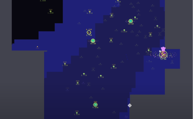 黑暗森林的战争迷雾是地图上玩家看不见的部分。创建新的帐账号时,只有一小部分起始区域的地图展示给玩家,而宇宙的其余部分会被战争迷雾覆盖。星图将通过 CPU 计算来探索扩大,探索的速度取决于 CPU 的性能。星图探索后,这部分信息将会被持续观察到,不像传统 web2 游戏中的战争迷雾那样,在侦察单位离开后又会重新回到迷雾状态,所以星图探索的速度,直接决定了可以获取情报量的多寡。情报量越多,做出的决策也就越精确。