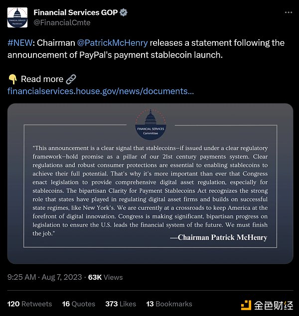 众议院金融服务委员会主席 Patrick McHenry 表示:“这一声明是一个明确的信号,表明稳定币——如果在明确的监管框架下发行——有望成为我们 21 世纪支付系统的支柱”。他表示,PayPal 的稳定币使得继续推动立法“比以往任何时候都更加重要”,尽管人们普遍预计这一举措在参议院受到阻力时会遇到巨大阻力。