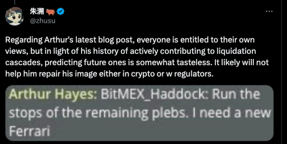 一夜暴富让也海耶斯成为 Crypto 圈内的众矢之的,让无数人眼红他赚钱好像真的很容易。当时币圈流传着一句玩笑话:别人赚钱的时候海耶斯赚钱,别人亏钱的时候海耶斯还是赚钱。还有一个 有趣的梗图 ,一则看似是海耶斯发给自己公司员工的消息:“给韭菜们都止损,我想买辆法拉利。”暗讽海耶斯操作市场和用户做对手盘。