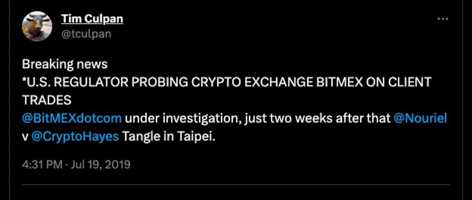 2019 年 7 月 19 日,仅仅在节目过后一周,CFTC 既美国商品期货交易协会就开始对 BitMEX 进行调查,怀疑 BitMEX 涉嫌对美国用户提供交易服务。根据美国法律,仅在塞舌尔注册的 BitMEX 是不能为美国用户提供服务。美国政府自然看不惯这种威胁自身权威、蔑视法律的“跳梁小丑”,这和马云在峰会上语出狂言后,蚂蚁金服便无缘上市是一样的道理。