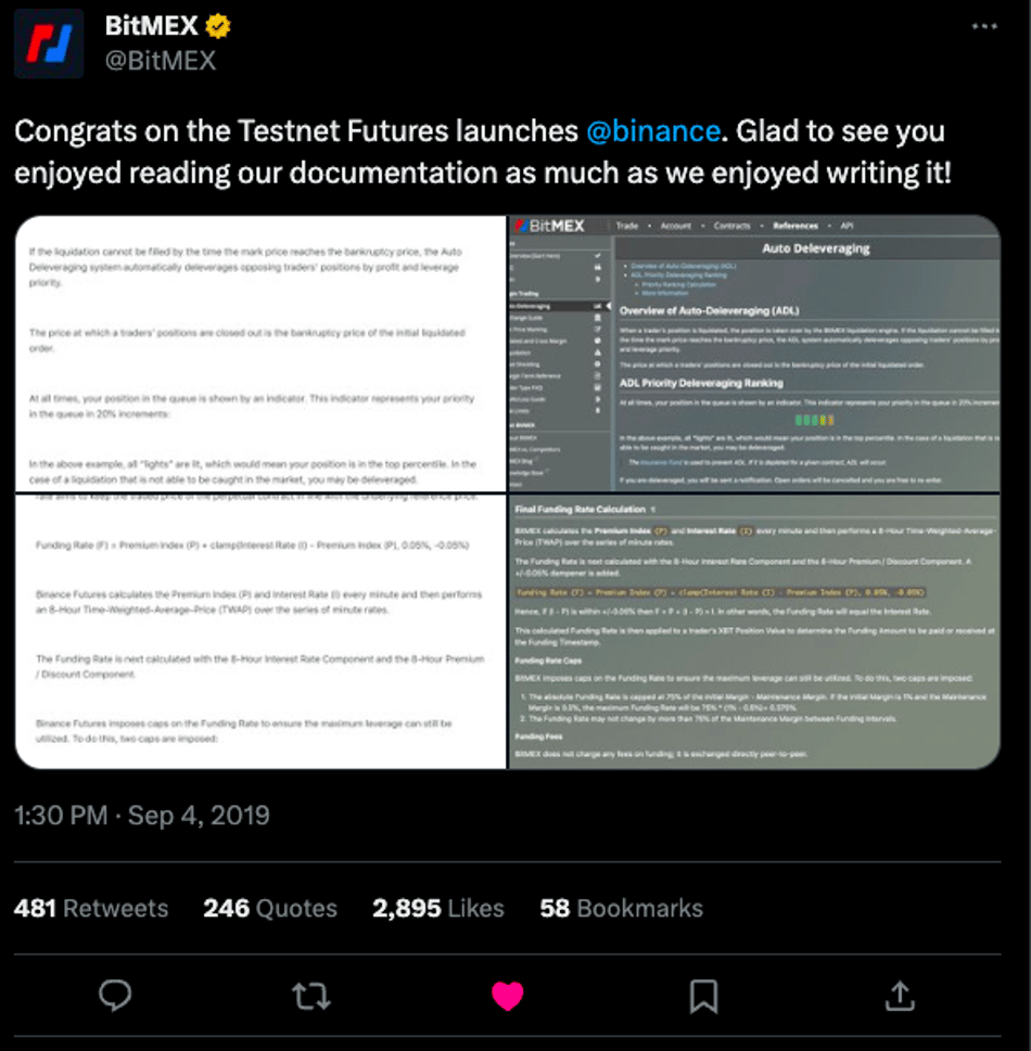 自 2016 年 5 月 BitMEX 推出了 第一款永续合约产品 XBTUSD perp 以来,越来越多的交易所跟随 BitMEX 脚步,相继推出永续产品。 Bybit 和 OKEx 在 2018 年 12 月推出, FTX 和 Binance 分别在 2019 年 10 月和 12 月推出。有趣的是,在 Binance 推出期货合约测试网的时候,BitMEX 还一度 发推嘲讽一番 :恭喜 Binance 发布期货合约测试网,看到你们抄我们文档就和我们自己写文档一样愉快,真替你们高兴!