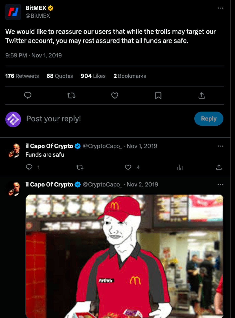 随即而来的,是各种棘手的问题: 11 月 1 日, BitMEX 意外泄漏了大量用户的邮箱地址 ,让事态逐渐向不可控的方向发展。紧接着,黑客 黑入了 BitMEX 推特 账号,并带有戏谑性地发布了两条推文:“Take your BTC and run. Last day for withdrawals,” 和 “Hacked.”但很快删除了。之后更有甚者,直接创建了一个 新的推特账号 ,开始源源不断地泄露用户 ID 和邮箱。然而只能 BitMEX 冠冕堂皇地宣称:Funds are safe。