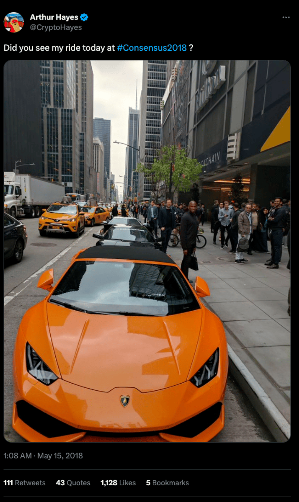 2018 年,海耶斯变身有为青年,回老家炫富。 5 月,海耶斯赴纽约参加 Crypto 盛会 Consensus,在进入会场之前就成为了全场焦点:BitMEX 的 三辆兰博基尼直接违章停在 曼哈顿 Midtown 的会场外。海耶斯自嘲这是一种营销策略“ guerrilla marketing”,并且大方承认这可能确实有点儿土了 “a little bit gauche”。有趣的是这些豪车居然是租来的,而且还因违章停车罚了大约一千刀的罚款。okay,这很符合海耶斯招摇过市、有钱任性的性格。
