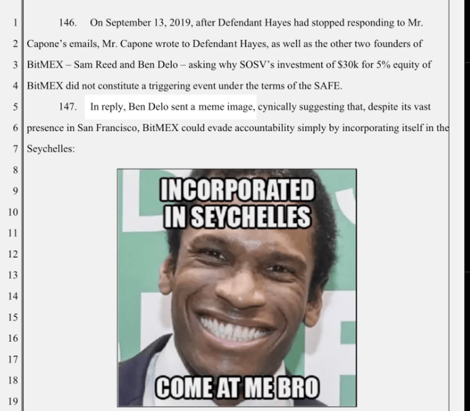 但其实,原告也拿 BitMEX 没什么办法,毕竟 BitMEX 是特意注册在塞舌尔来规避美国监管的。BMA 只能从客户的邮件信息,来间接证明 BitMEX 在美国有运营业务,这点微不足道的证据后来还被 BitMEX 的人拿来调侃 :老子在塞舌尔注册的,过来干我啊!他们仍旧很狂。