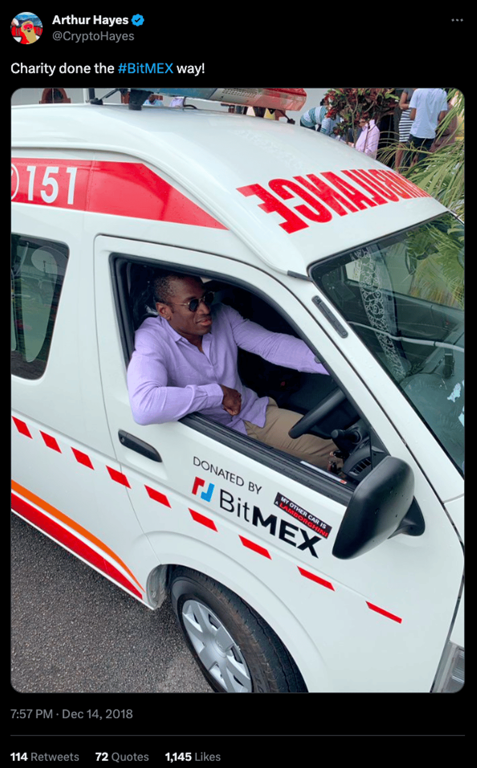 然而海耶斯并未停止装逼的脚步。2018 年底,海耶斯推特发了一张自己在 BitMEX 给塞舌尔捐赠了一辆救护车上的 照片 ,照片里的海耶斯戴个墨镜的样子,让人看着就不爽。而且这张照片的亮点是下方的贴纸,上面写着:“我另一辆车是兰博基尼。”
