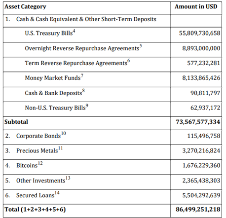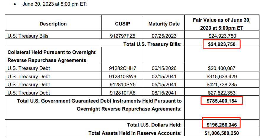 其次,在资产披露端,Paxos 也是尽心尽力,定期披露美债持有份额和稳定币流通量,发布审计报告。以 USDP 为例,根据下图披露的审计报告中,它们与充裕的现金、短期国债以及美联储逆回购的高流动性资产锚定。