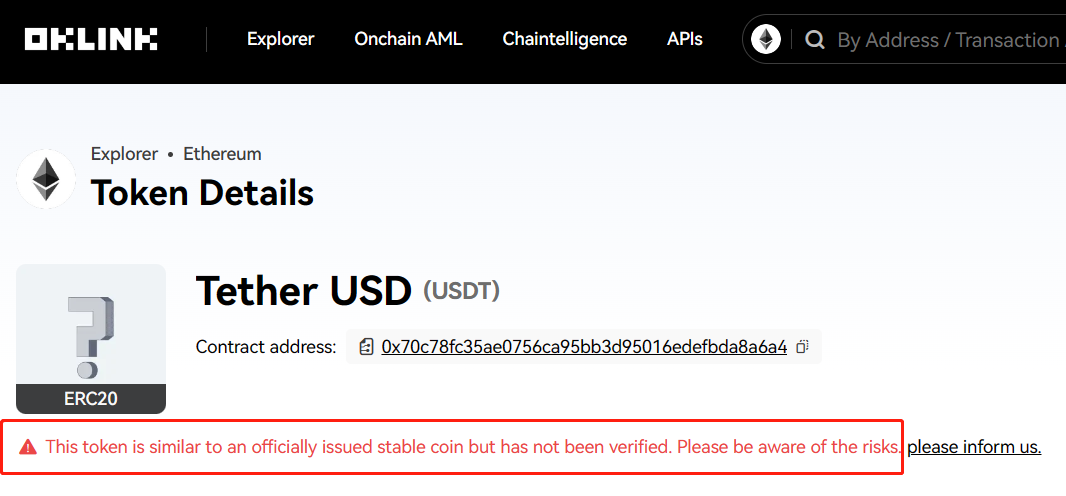稳定币在发行过程中会产生众多问题,比如 Paypal 在发行完稳定币后,假币就如雨后春笋般的冒出来。仿冒稳定币已经成为诈骗人员常用的伎俩,根据 OKLink Explorer 显示,稳定币市占率最高的 Tether 也被非法人员仿冒,导致多名投资人遭受损失。