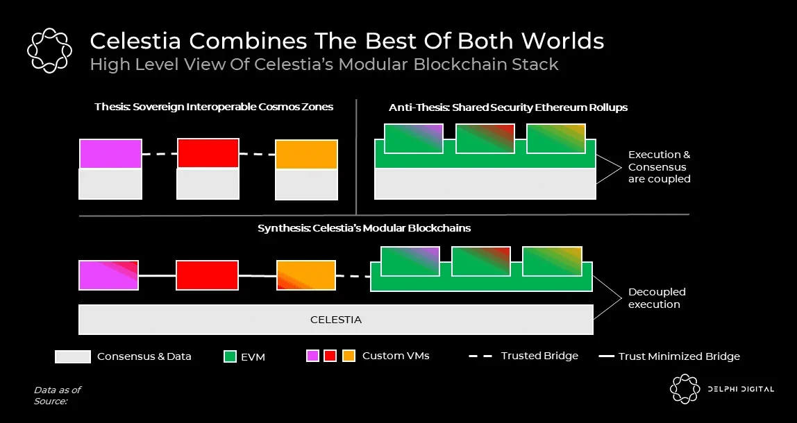 Celestia 是一个数据可用性层和 Cosmos 链,可能是模块化板块中最重要的项目。它的原生代币 TIA 将需要从 Cosmos 桥接到其他生态系统,而 Celestia 的 Rollups 可能会通过 IBC 桥接资产。
