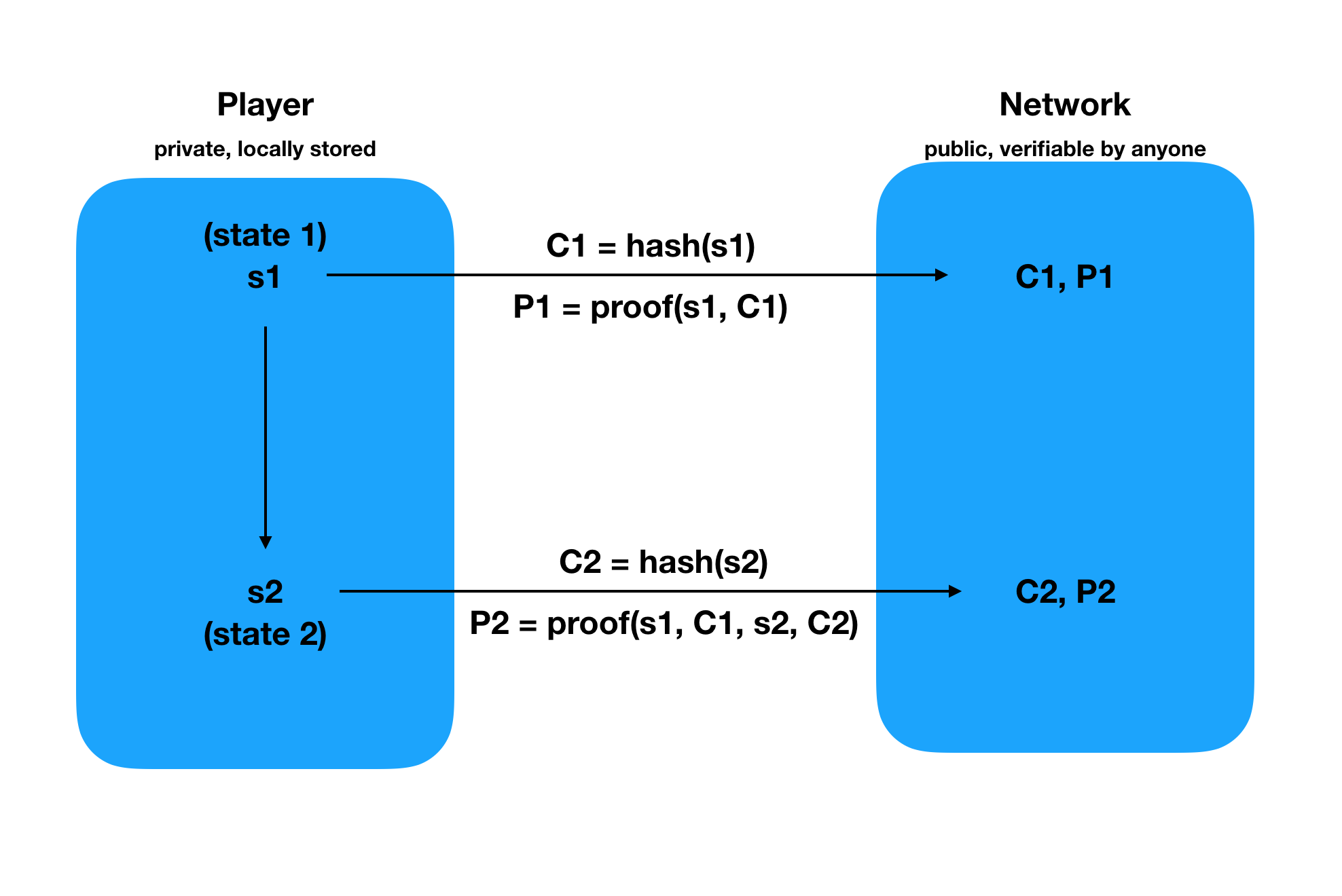 比如当玩家想要采取行动时,受到黑暗森林的法则影响,玩家不能暴露自己的坐标,却要从 A 星球移动到 B 星球,他们需要提交 A 跟 B 的坐标以证明这是有效的,但以太坊的区块信息是完全透明的,《Dark Forest》则通过以下方式去实现信息隐藏。玩家选择要离开的星球和目的地星球,这两个星球的位置是玩家的私有信息。计算要离开的星球和目的地星球的位置的哈希值,然后将这两个哈希值提交到区块链。在这个阶段,玩家会提交一个承诺(Commit 阶段),由于哈希函数的单向性,这些提交的哈希值不能用来确定玩家的实际行星位置。而下一个阶段是验证(Reveal 阶段),在此阶段,玩家生成并提交一个零知识证明,证明他们的行动是有效的。这个证明可以被任何人验证,但不会透露任何关于玩家星球位置的信息。