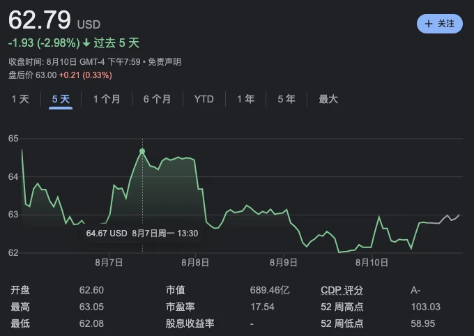 此消息公开后,PayPal 的股价上涨了超过 2% ,最高接近 65 美元;但在随后的第二天,股价则迅速从 65 美元左右跌至 62.65 美元,现报 62.79 美元。