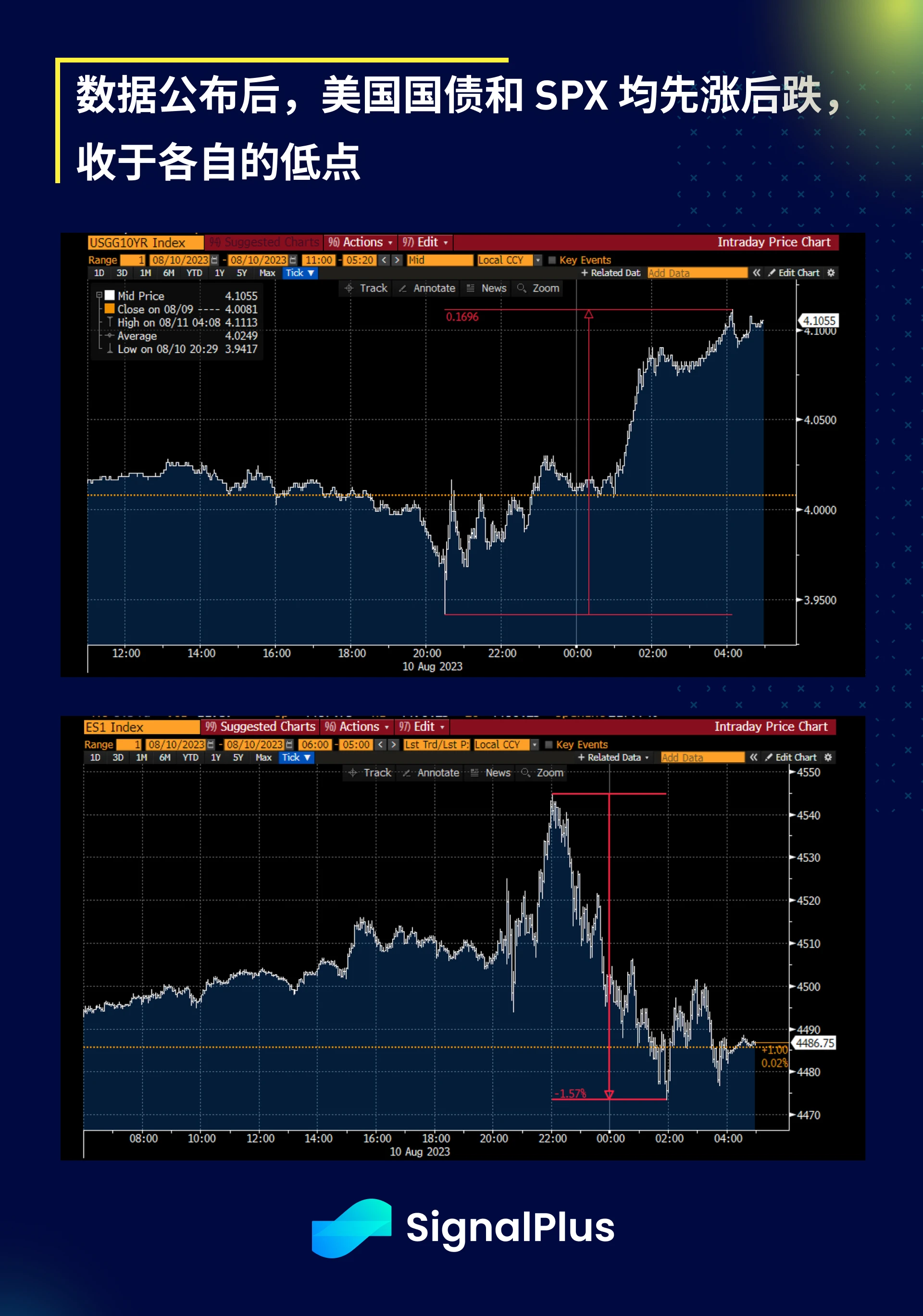 看起来走软的 CPI 数据,加上初请失业金人数小幅上涨(+ 2.1 万至 24.8 万),使得市场一开始出现风险情绪升温的走势, 10 年期收益率在该数据公布后立即下跌约 5 个基点,而 SPX 在首 1.5 小时内反弹约 0.8% ,然而,市场重演上周五非农就业数据日的走势,数据结果本应相当理想,但市场突然反转走跌, 10 年期收益率从低点走升 15 个基点,而 SPX 指数则从当天的高点下跌 1.6% ,双双收于各自低点。
