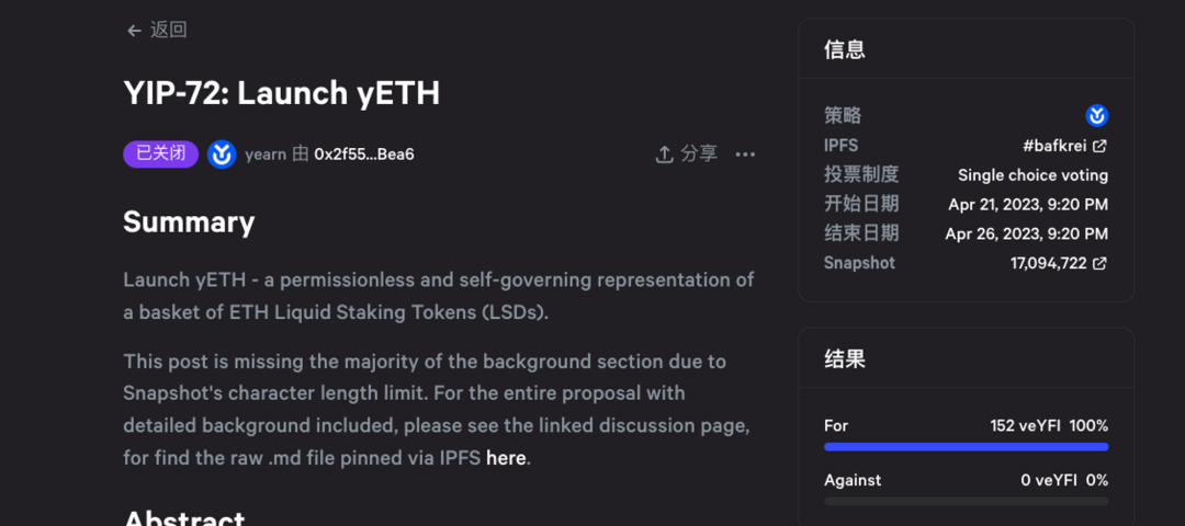 Yearn 团队与 4 月正式发起了提案并收获了全票通过,目前 yETH 的产品未正式上线。