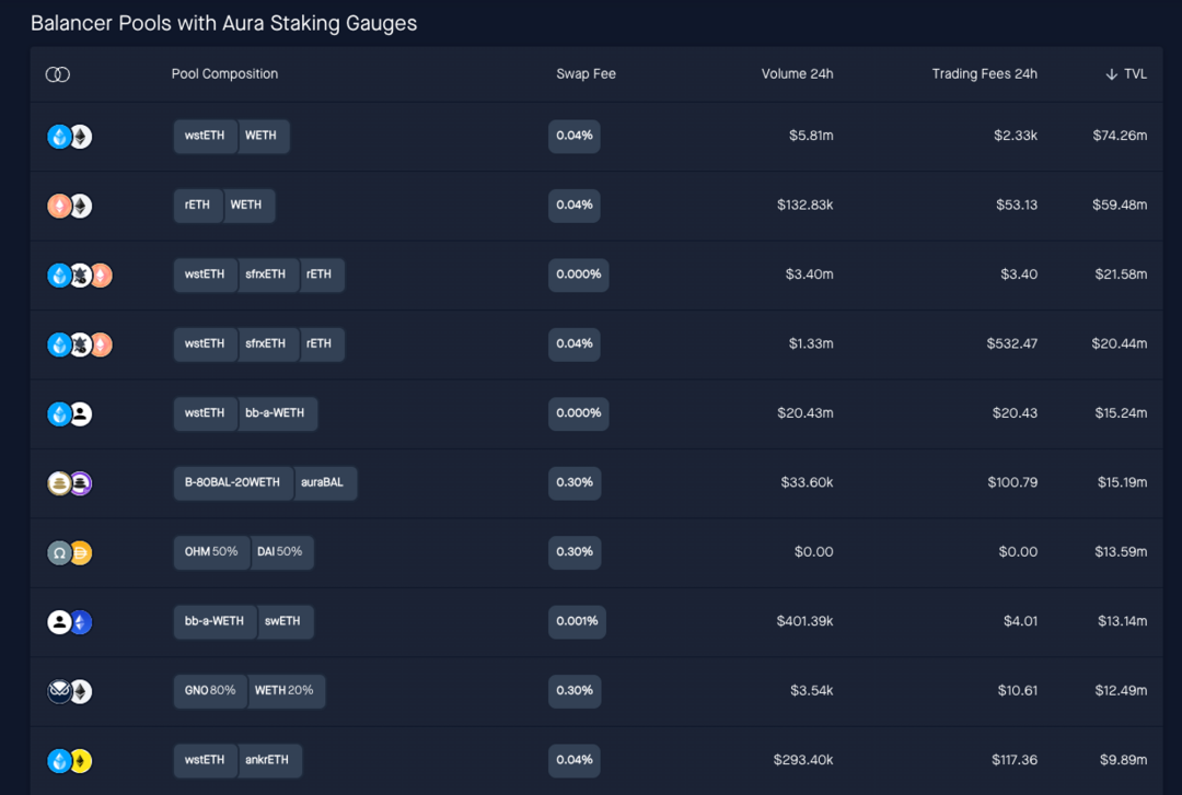 基于 Balancer 构建的生态收益治理平台 Aura,也在利用自身超过 35% 的 BAL 票权,激励着不同的 LSD 与 LSDfi 协议来 Balancer 建池。