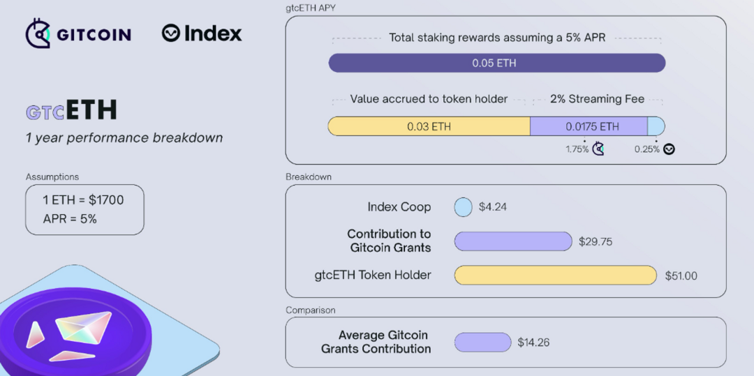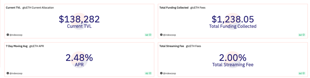 此外,Index Coop 与 Gitcoin 合作推出了 gtcETH,允许用户通过 ETH 质押奖励为 Gitcoin grants 提供资金,同时收取 2% 的流媒体费用,其中 1.75% 引导至 Gitcoin grants, 0.25% 至 Index Coop。同时,IndexCoop 还拥有基于 Set Protocol 的杠杆流动性质押策略产品 icETH,可以提供更高的 ETH 收益。目前,gtcETH 的 TVL 为 138, 282 美金。