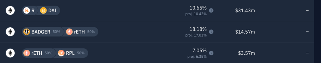 目前 wstETH 通过 Aura Finance 激励的 TVL 超过 3000 万美金,LSDfi Raft Finance 通过 Aura 引导的流动性超过 3000 万美金, BadgerDAO 的原生代币与 rETH 的流动性约 1500 万美金,总共吸收的 LSD 相关资金池超过 2 亿美金。