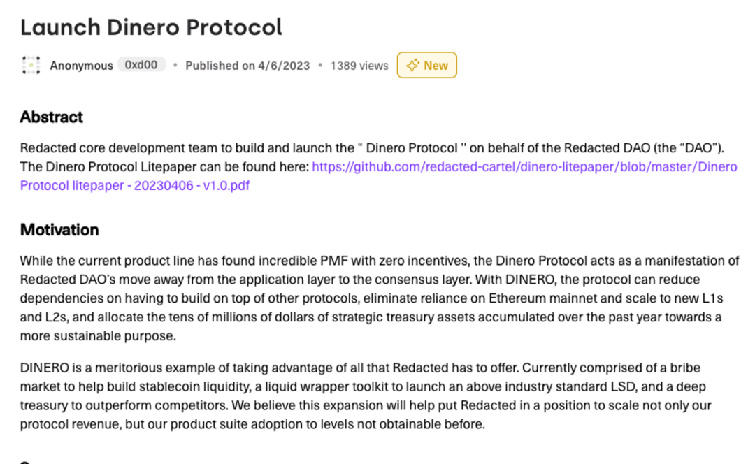 贿选协议 Redacted Cartel 于 4 月正式公布了其推出由以太坊区块空间支持的稳定币协议 Dinero ,一个通过创建公共且无需许可的 RPC 来利用优质区块空间市场,并与 ETH 质押相结合的衍生品协议。