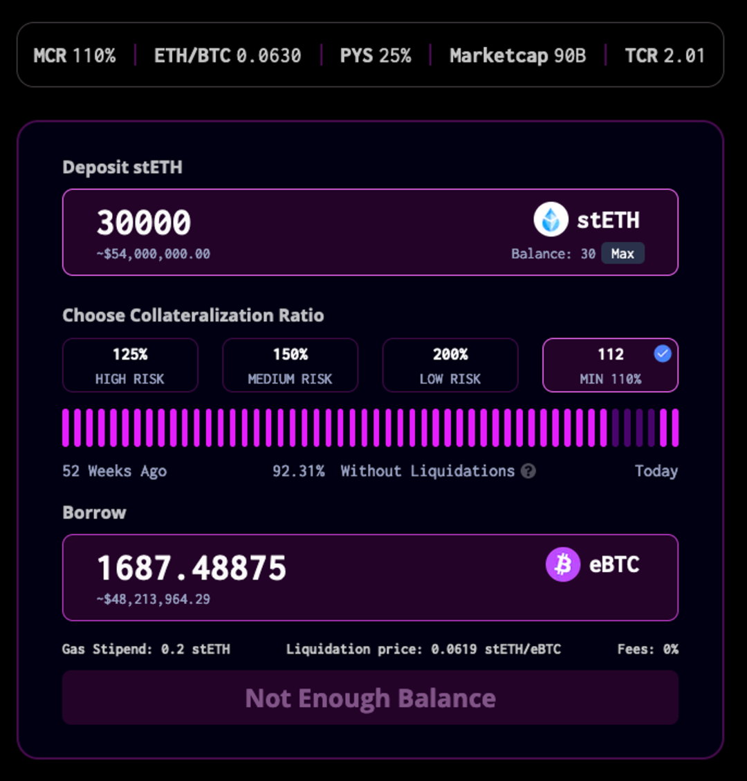 eBTC 采用基于 CDP 的设计,允许任何人使用 stETH 以 0% 的费用借入 eBTC,目标是成为在主网上利用 stETH 的最具资本效率的方式。eBTC 允许最低为 110% 的抵押率,并为用户提供 10 倍以上的杠杆,使他们能够最大化其资本敞口。同时,协议允许用户采用多种市场策略,包括做多 ETH 赚取利息以及以 10 倍杠杆做空 BTC。由于 ETH/BTC 的相关性,用户还可以利用其 ETH 质押收益来降低清算风险。
