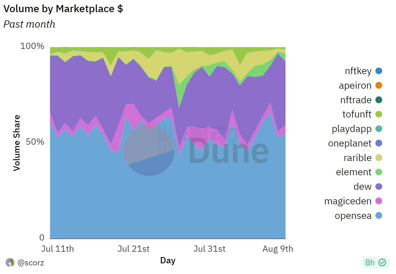 可以看到,dew 已经牢牢占据了 Polygon NFT 交易市场的第二把交椅