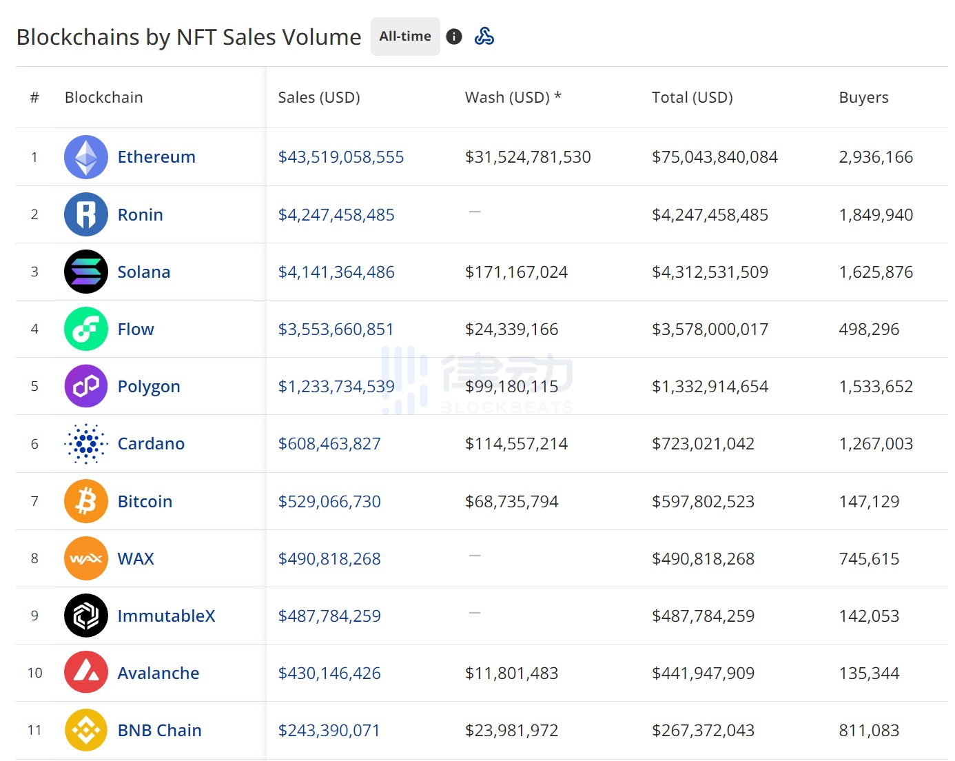 其实,Polygon NFT 市场的历史总成交量在所有区块链网络中排名第 5 。如果我们把 Ronin 这样的「Axie 游戏链」和 Flow 这样的「NFT 专链」去掉的话,Polygon 仅次于 ETH 和 Solana。