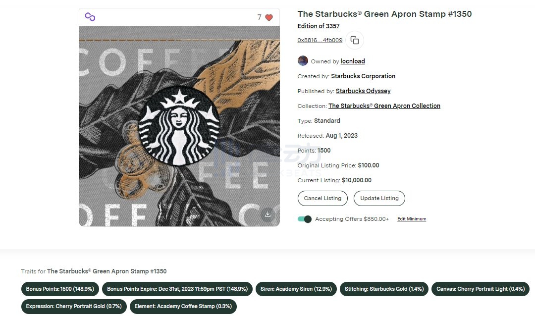 星巴克忠诚度奖励机制 Starbucks Rewards 的拓展「Starbucks Odyssey」建构在 Polygon 上,目前场内的总市值超过 900 万美元,二级市场成交量超过 250 万美元,累计 Mint 了超过 21 万个「旅程邮票」NFT。