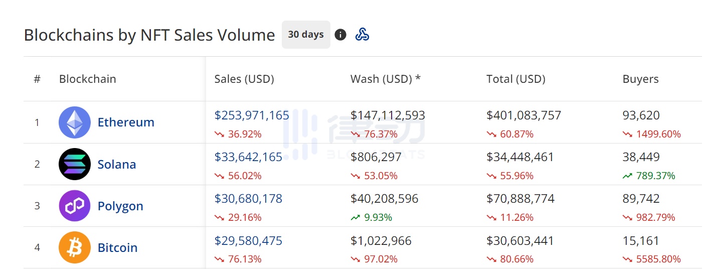 在过去的 30 天里,Polygon NFT 市场的总成交量排名第 3 ,与 Solana 的总成交量差距非常之小。考虑到比特币 NFT 的总成交量里包含了很多 BRC-20 Token 的成交量,Polygon 可以说是「稳 3 抢 2 」的水平。