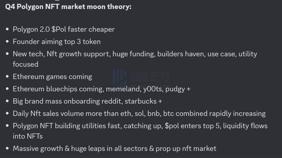 Polygon NFT 现阶段在 Web2 巨头入驻和游戏生态的发展上有突出表现,加上之前 Polygon 2.0 ($POL)的宣布,有些 NFT 玩家对 Polygon NFT 市场的发展有着较高的乐观情绪,甚至基于这几点提出了「Polygon NFT Q4 登月理论」: