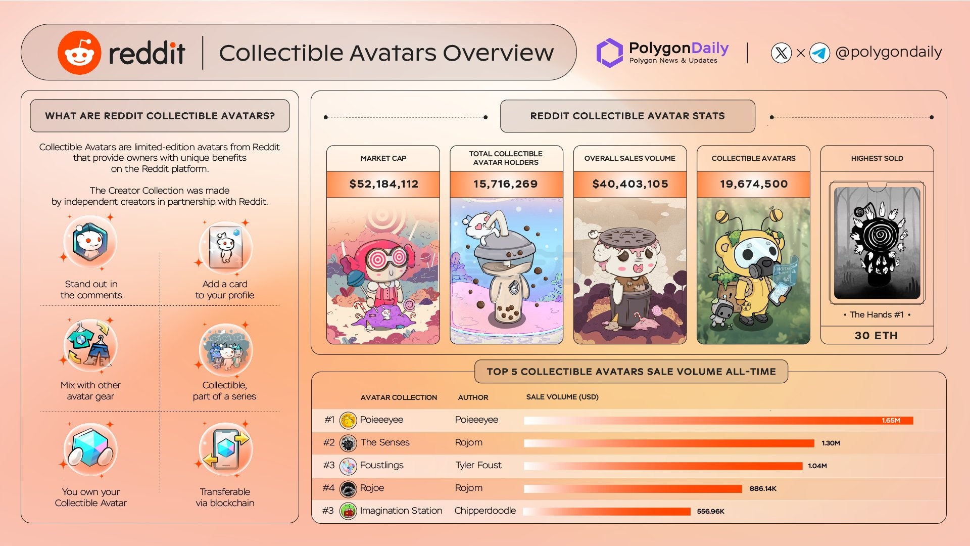 Reddit 的 Collectible Avatar 在 Polygon 网络上已经发行到第 4 代,总市值超过 5000 万美元,销售额超过 4000 万美元,有接近 1600 万名持有者,是全球持有者数量最多的 NFT 系列。