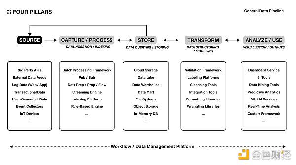 当前的 Web3 数据原语之间没有连接,它们独立地提取和处理数据。这使得实验信息处理的协同效应变得困难。为了解决这个问题,本文介绍了在 IT 市场常用的数据管道,并将现有的 Web3 数据原语映射到该管道上。这将使使用案例更加具体化。