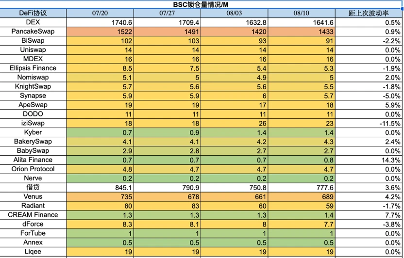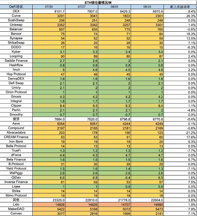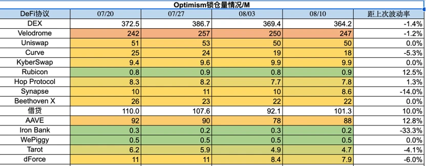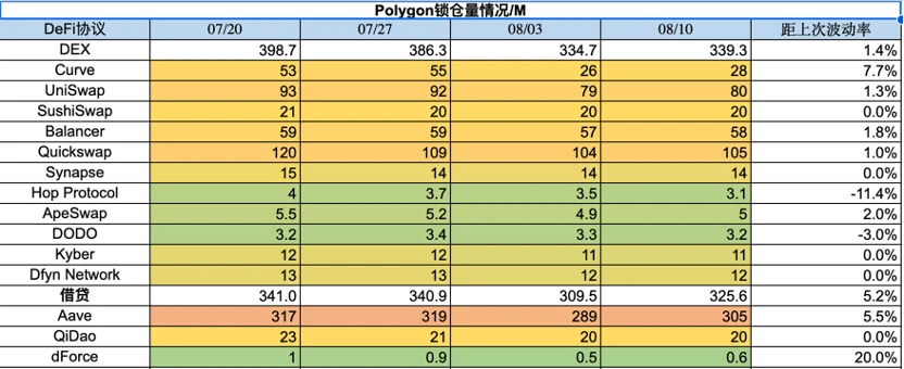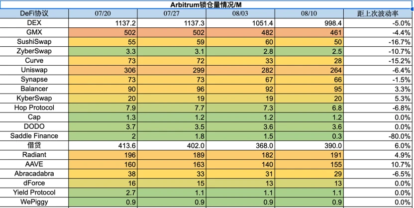 本周 TVL 总体反弹 1.2b,但从中期看仍然处于下降。本周 ETH 链占比上涨 1.5% ,回到了月初的水平。Layer 2 各公链的 TVL 除 polygon 有 8.9% 的上涨外,其他都在下跌,其中 Arbitrum 下跌最多,跌幅 2.67% 。