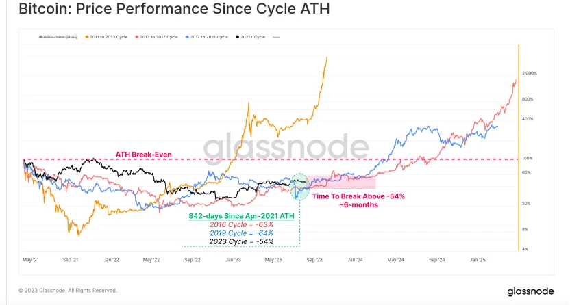 BTC 波动率下降,或进入长期横盘期。从历史上看,在市场加速突破-50% 跌幅的牛熊分界线前, 15-16 年和 19-20 年周期都经历了 6 个月的横盘无聊期,这或许表明未来可能会出现的情况。在这些周期中,最初的底部反弹非常强劲,但会导致长期的震荡盘整。