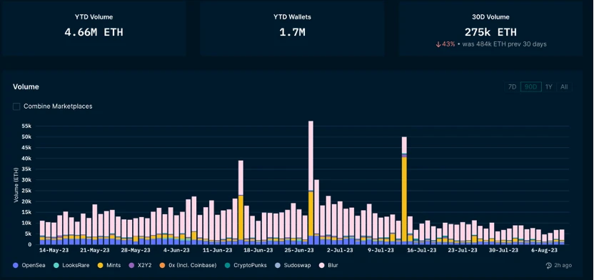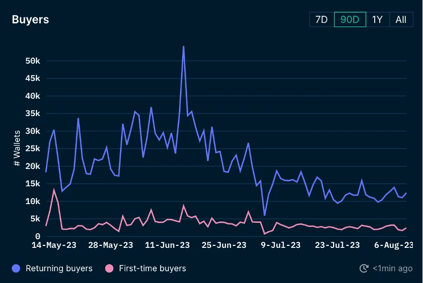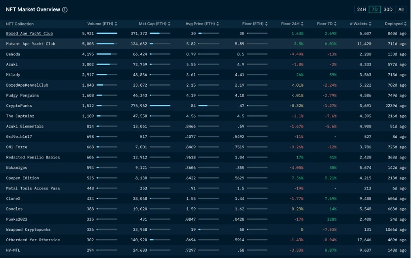本周蓝筹项目的地板价有涨有跌,其中,BAYC 和 MAYC 有小幅度回升,但 Azuki 和 DeGod 都有不同幅度的下跌。从 30 天的跨度看,几乎所有蓝筹项目都有不同程度下跌,其中 Azuki 下跌 30% ,BAYC 和 MAYC 分别下跌 13% 。 Blur 的市场份额持续保持大幅领先。从 NFT 新老买家的活跃钱包地址看,本周老用户付费 NFT 情况和新用户入场都有小幅回升。