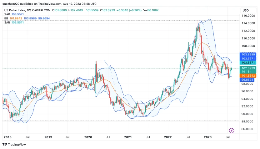 货币流动性趋紧。市场共识预期是美联储 9 月不加息,明年开始降息。美国财政部最新发债计划大增,将对Q4流动性影响较大。美元指数反弹,受到流动性收紧的支撑。美股结束上涨趋势,开始周线级别调整。加密市场走势与美股相反,更多受到现货 ETF 消息影响。