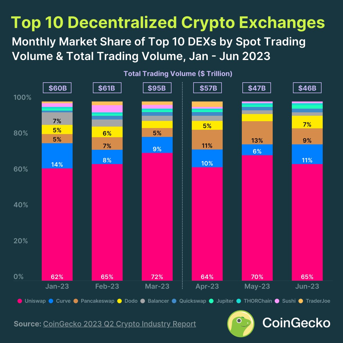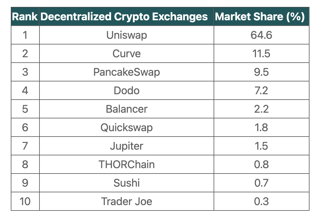 前十大DEX:Uniswap市场份额为64%,Curve市场份额为11.5%