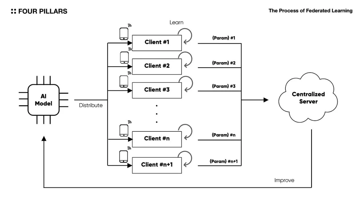 * 联邦学习是一种通过将原始模型分布在多个原生客户端上,使用存储的数据对其进行训练,然后在中央服务器上收集学习到的参数的方法,用于训练人工智能模型。