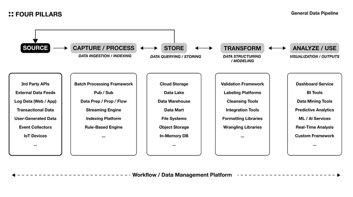 上图显示了在现有 IT 基础设施市场中用于构建数据管道的通用架构。适用于分析目的的数据从正确的数据源收集,并根据数据的性质和分析要求存储在适当的存储解决方案中。例如,数据湖提供了用于可扩展和灵活分析的原始数据存储解决方案,而数据仓库专注于存储结构化数据,以进行针对特定业务逻辑优化的查询和分析。然后,数据以各种方式被处理为洞察力或实用信息。