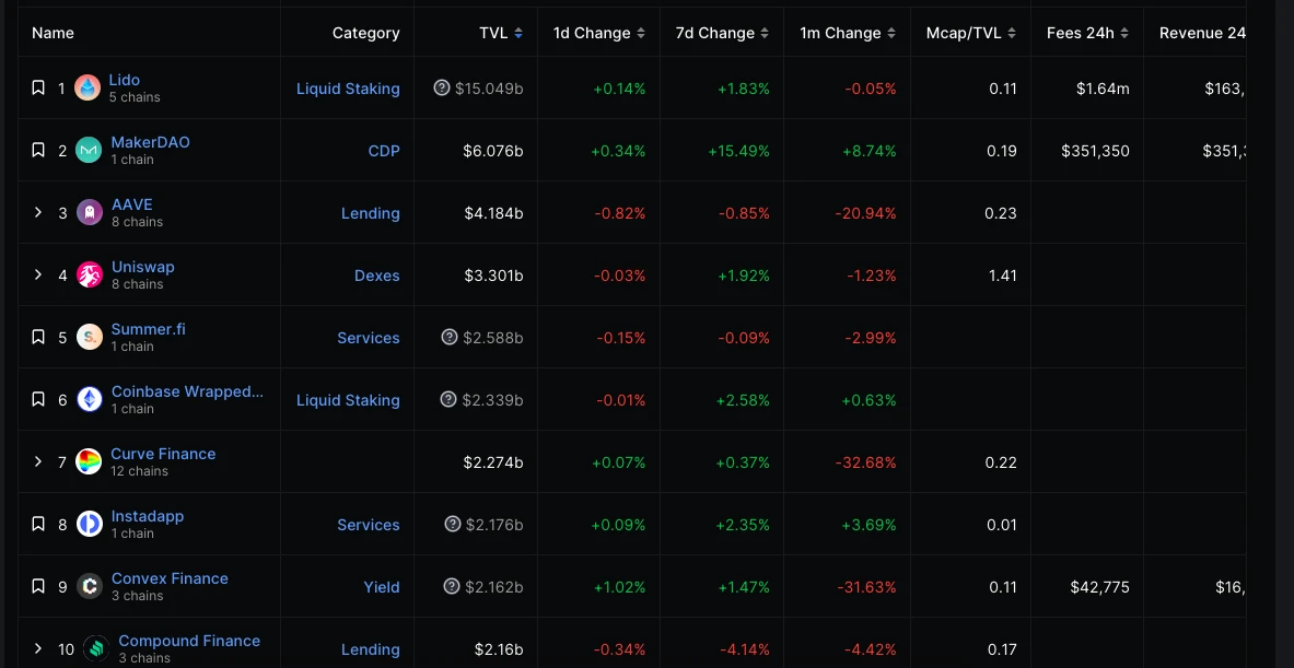 DeFiLlama 数据显示,上周链上锁仓抵押品价值从 233.7 亿美元上涨至 245 亿美元,环比上涨 4.8% 。从单个项目来看,锁仓价值前三名分别是: Lido 150.4 亿美元; MakerDAO 60.7 亿美元; Aave 41.8 亿美元;