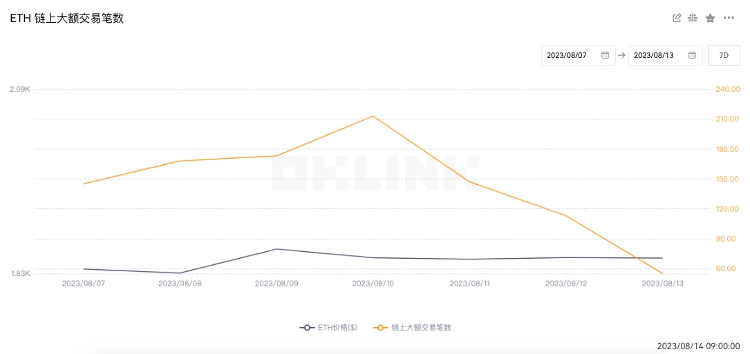欧科云链 OKlink 数据 显示,上周链上大额交易笔数达到 1015 ,相较于前一周(1309)环比下降 22.4% ,巨鲸交易热情明显下降。