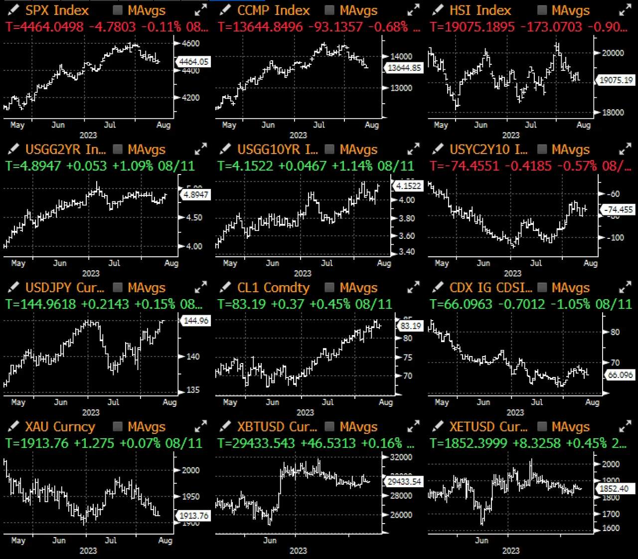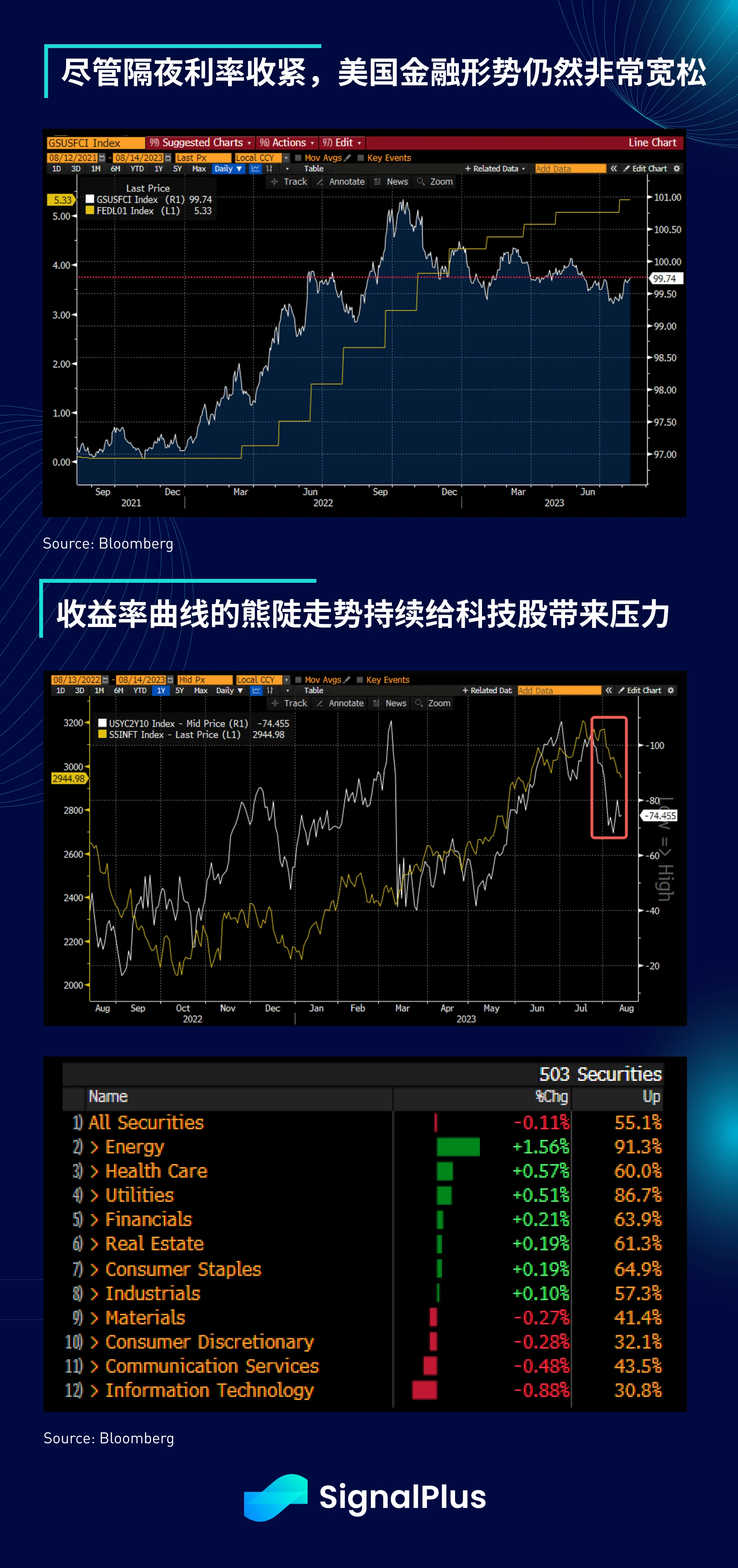大宗商品价格上涨,油价保持在 80 美元以上,美债发行规模增加,加上在隔夜利率收紧时金融形势仍处在同样宽松的水平(现在 5.3% vs 约 3.80% 的水平), 即使市场越来越相信美联储基本上已经结束了本轮加息周期,在我们进入月底 Jackson hole 会议的此时,债券看跌的叙事仍正在形成 ,过去一周,收益率曲线的熊陡走势持续给股市带来压力,科技股的价格走势特别受到影响,Nvidia 自月初以来下跌了 15% 。