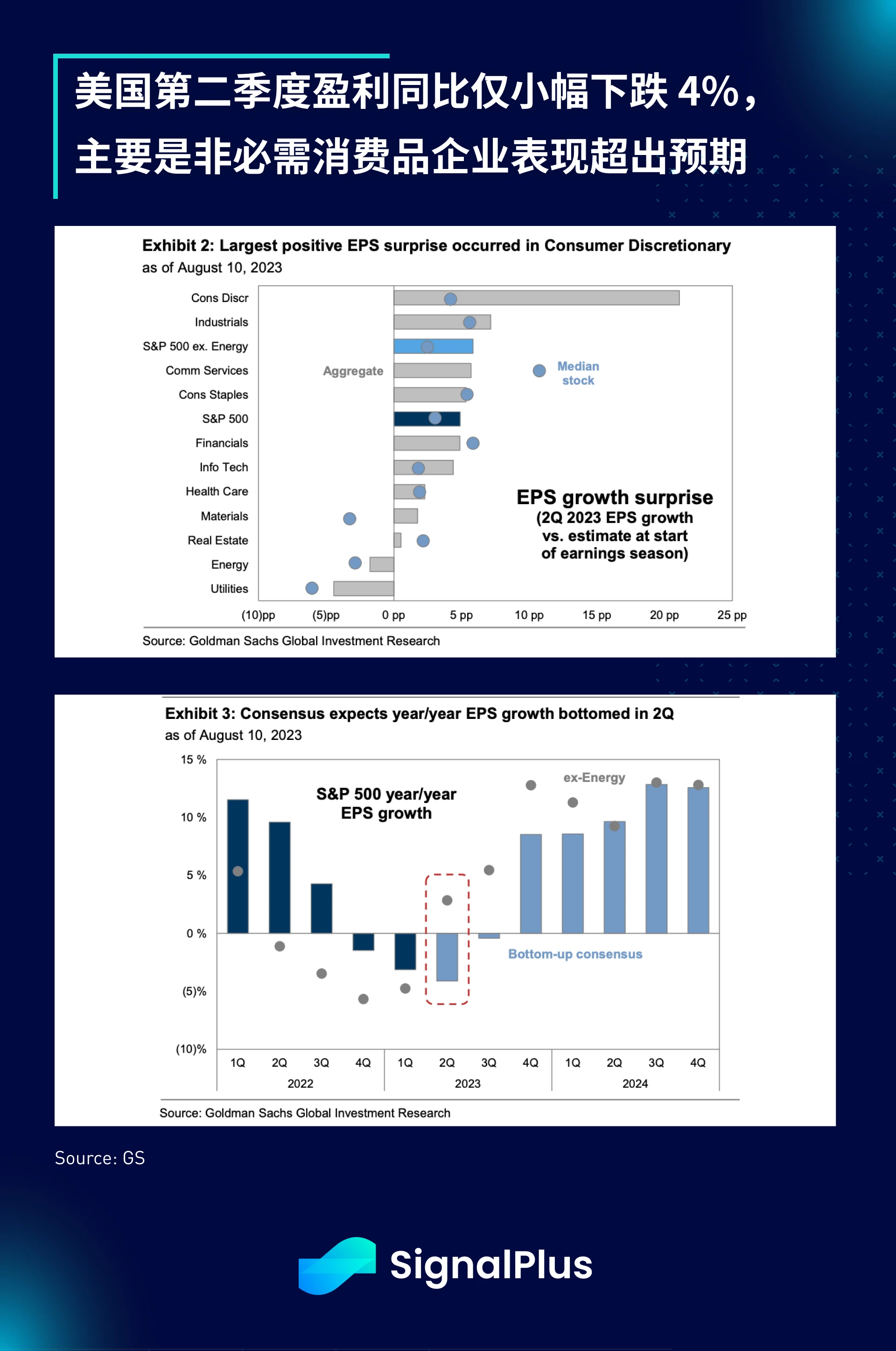 回到美国财报方面,本周将有 一连串面向消费者的企业公布财报结果,包括 Walmar、Target 和 Home Depot ,美国消费者持续展现卓越的韧性,目前第二季度盈利同比仅下跌 4% ,显著优于投行预测的下跌 9% ,特别是非必需消费品行业的表现超出预期;此外,市场普遍预计第二季度盈利将是当前经济放缓周期的低谷,EPS 增长预计将在年底前恢复正值。