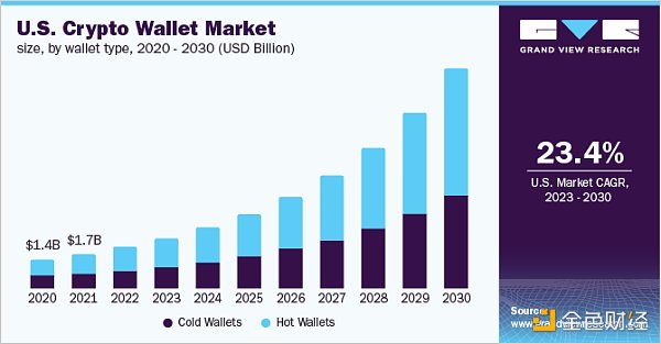 来自grandviewresearch的数据显示,截至 2022 年 8 月,全球加密钱包用户数量从 2021 年 8 月的 7632 万用户达到 8402 万;2022 年全球加密钱包市场规模为 84.2 亿美元,预计从 2023 年到 2030 年将以 24.8% 的复合年增长率 (CAGR) 增长。